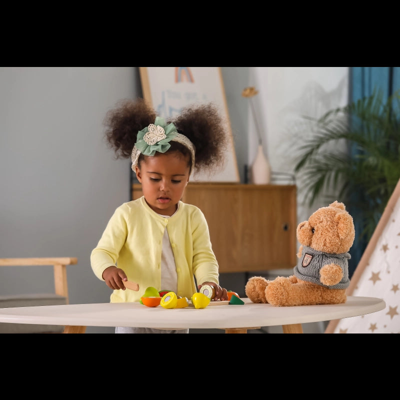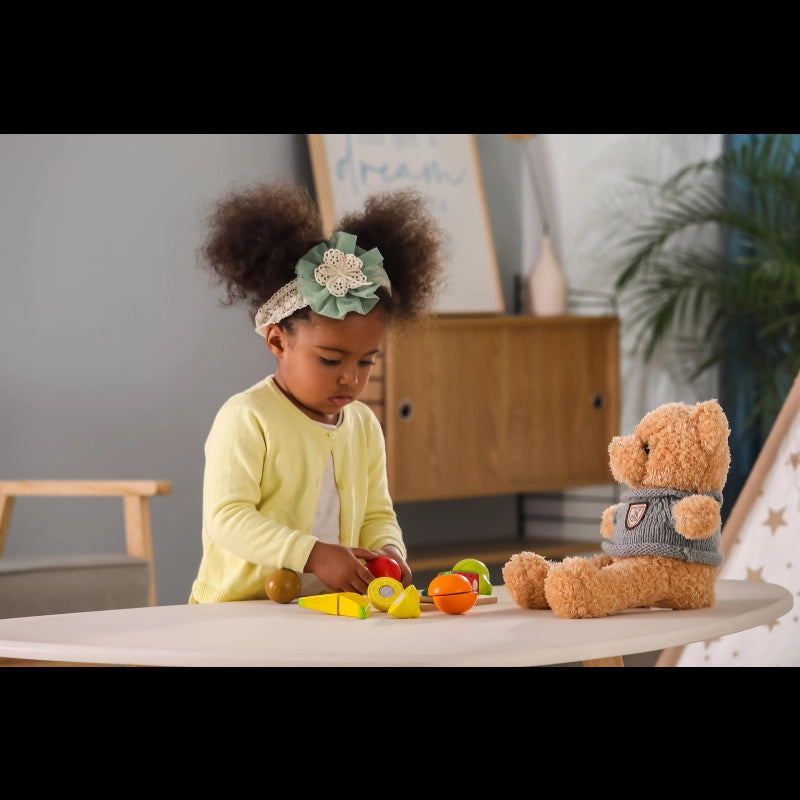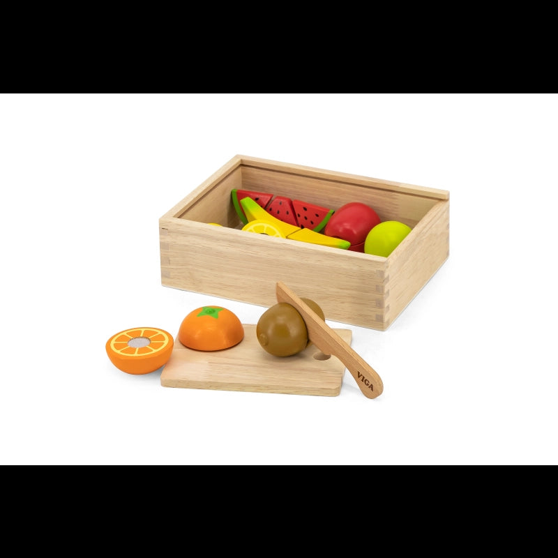 A wooden food playing set for kids to play with and learn their healthy eating habits!Smooth surfaces and non-toxic materials ensure safe to play even while the smallmouth touches the toy.Cut fruit in half and serve them to your customers, it is a great role-playing toy for kids and improves their imagination ability.After tasting the food, kids can fit them back together again with Velcro.While cutting and fitting, kids' hand-eye coordination and motor skill can be perfectly explored.Comes in a wooden box with acrylic sliding lid for cleaning up and storage.-Includes: Various fruit, a safe knife, a cutting board with a handle for easy transporting, and a wooden box with an acrylic sliding lid.