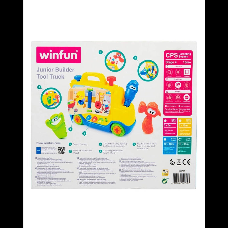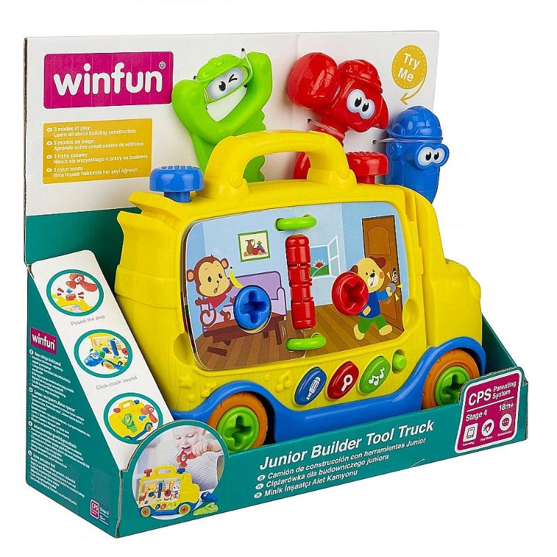 This toy is for the little builders!Interactive tool truck with light-up buttons and melodies.3 Modes of play: Tools mode, Game mode and Music mode.Lift the pegs with the hammer, twist the screwdriver to hear click-clack sound and saw on the saw-spaces.2 Colorful turning pages with sound effect.Equipped with tools hammer, saw and screwdriver.Designed to encourage learning, and improve fine motor and communication skills.&nbsp Batteries included.Designed based on Winfun CPS parenting system for developing the baby's cognitive, physical and social skills.