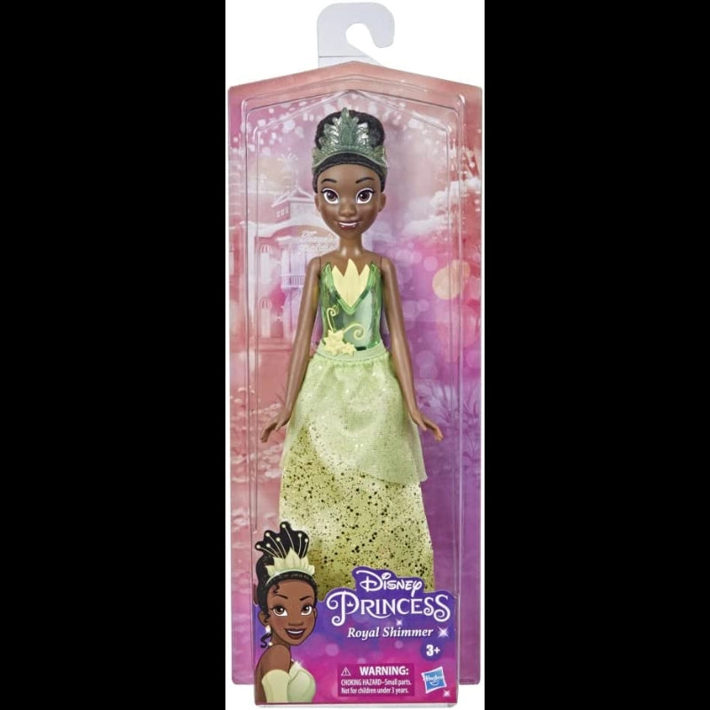 Tiana is ready for shimmering adventures with your little princess!With this Royal Shimmer Disney Princess doll, kids can imagine Tiana cooking up exciting adventures as they recreate favorite movie moments or make up their own new stories. Inspired by her animated character, this Disney doll includes a fashion doll skirt and accessories like tiara and shoes, in her signature green color. Kids can have fun recreating scenes from Disney's film Princess and the Frog, with the fashion doll's black hair and signature accessories.  -Includes: Doll, skirt, tiara, and shoes.