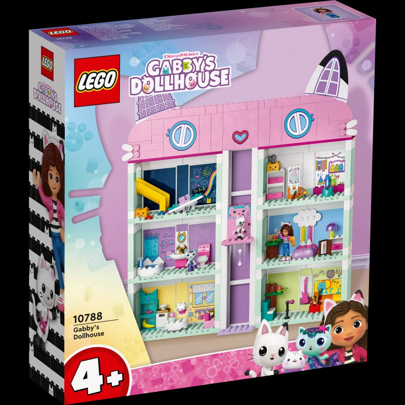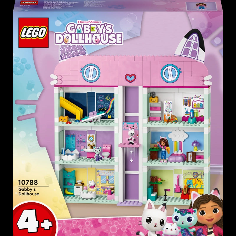 Take on a new building adventure with these inspirational LEGO® sets!What will you do first in Gabby’s Dollhouse? You could bake a cake in the kitchen, play on the slide in the playroom, get creative in the art room, play piano in the music room, pamper yourself in the bathroom, take a nap in the bedroom or head to the rooftop for a party on the spinning dance floor. There’s so much to discover in Gabby’s extraordinary dollhouse that you’ll never want to leave!Rooms include a kitchen, playroom, art room, music room, bathroom and bedroom.The dollhouse measures over 13.5 inches (34 cm) high, 12.5 inches (31 cm) wide, and 3.5 inches (9 cm) deep.LEGO® sets are made of high quality materials under the best quality and safety standards.Launch date: Aug 01, 2023.-Includes: 498 pieces including  a LEGO® starter brick element Gabby, Pandy Paws, MerCat, Cakey, accessories (a banana, berry, cupcake, cup, bowl, bottle, scissors, paintbrush, palette, hairbrush, shampoo bottle, book, flower, microphone, guitar, saxophone), and building instructions.