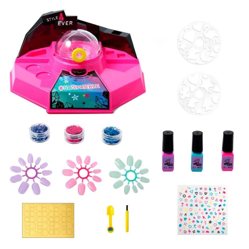 Create your own unique styles with the most sparkly Nail Studio, at home!  Paint your nails with the trendy nail polishes you will find in the packaging, add your favorite glitter and add it in the glitter machine. Put your fingers in the dome to make them sparkly! You can add stickers and imagination to have the trendiest results, there are more than 100 stickers are included! If you want to change your style all the time, you can decorate the fake nails provided. You can even get glitter tattoos! Choose your design and the glitter you prefer, put them in the machine and, once ready, apply the sticker tattoos to your skin. Style and stand out!  -Includes: Glitter device, nail polishes, glitter pots, decorations, stickers and all the tools you will need for your creations.