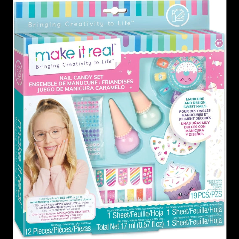 Sweet treats at your fingertips!A complete nail art set in an adorable candy theme. All of the sweetest ways to deck out your fingers and toes! Press-on nails, nail wraps, polish, gems, and decorative nail stickers all so cute your manicure and pedicure might give you a toothache! Nail polish and press-on nails are vanilla-scented for enhanced sweetness. Apply nail wraps for funky patterns with little effort. Nail polish is water-based and safety tested for kids.-Includes: 2 vanilla-scented nail polishes, nail file,12 pieces of vanilla-scented press-on fake nails, sheet of nail stickers, sheet of nail rhinestones, sheet of nail wraps, and instruction sheet.