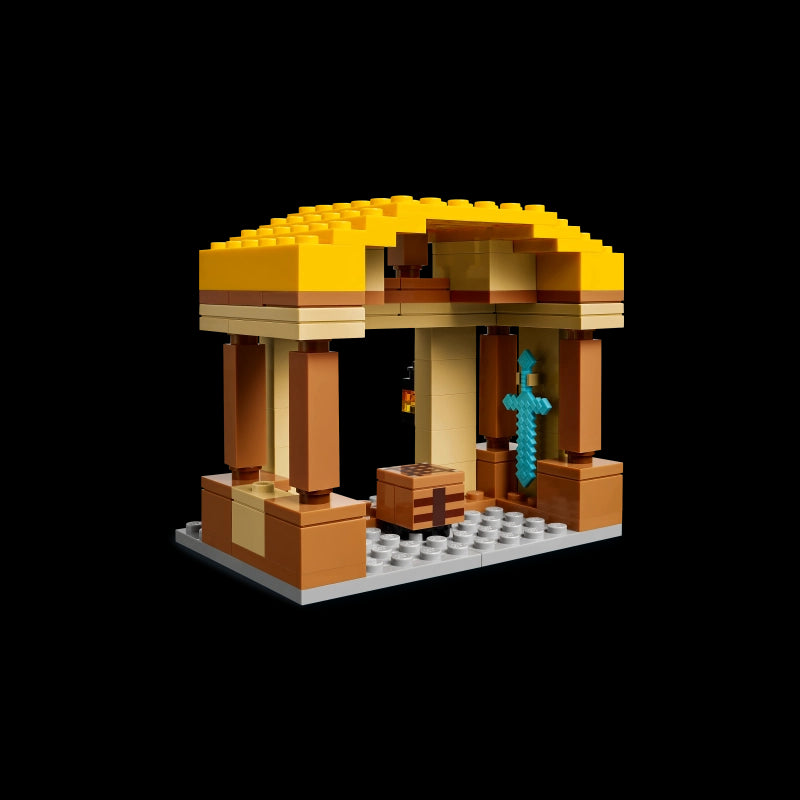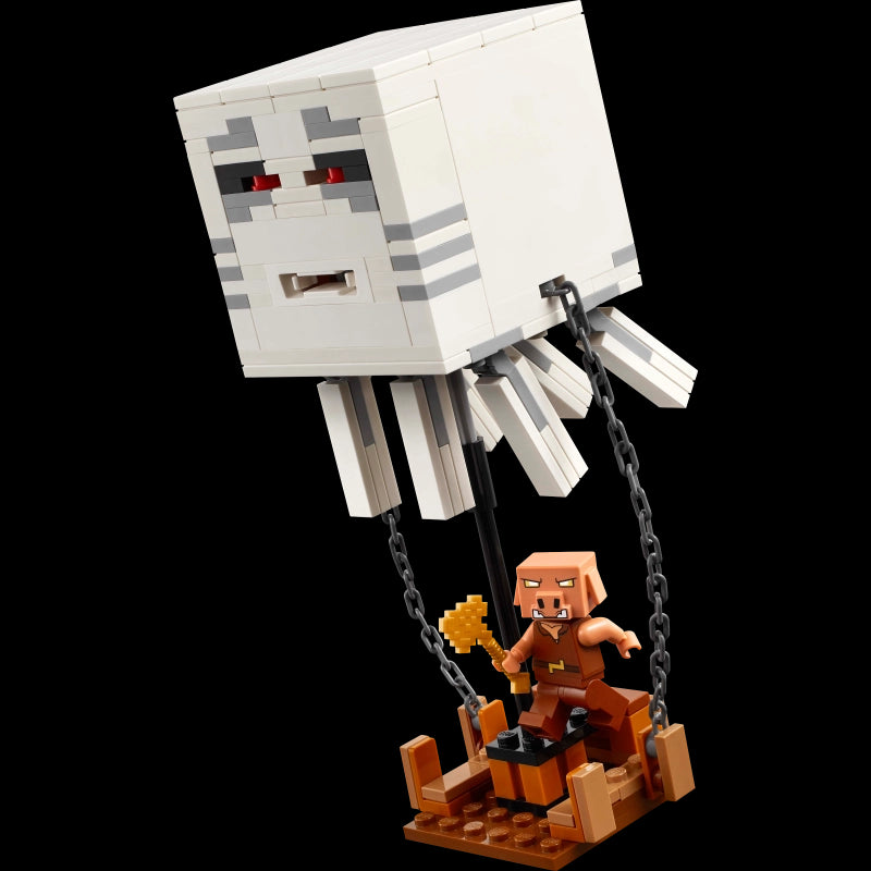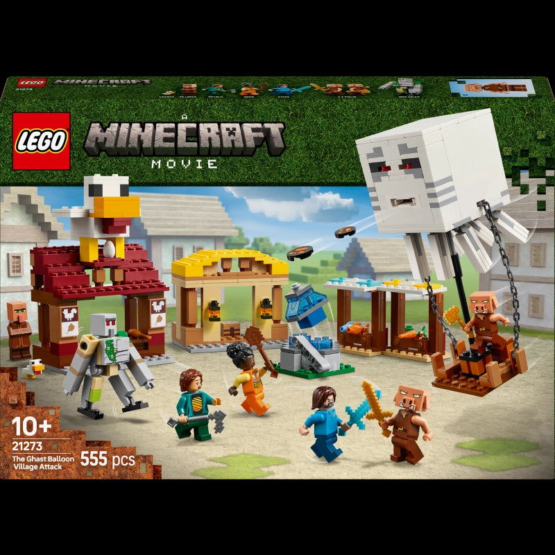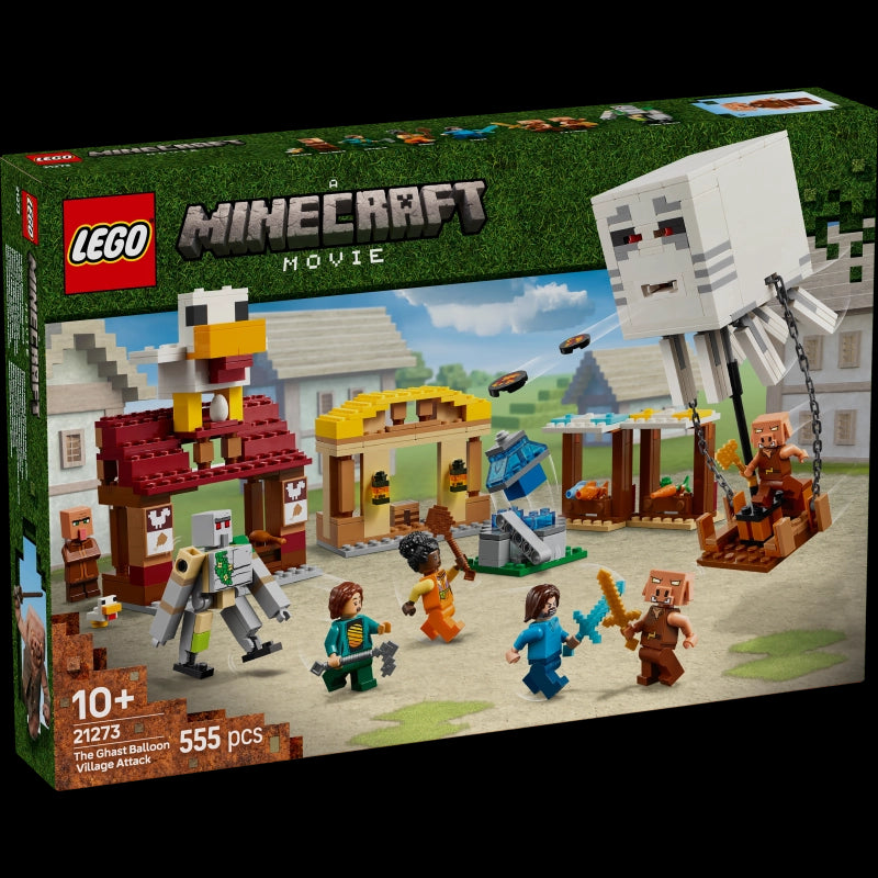 Take on a new building adventure with these inspirational LEGO® sets!Piglins are attacking the village from their ghast balloon! They launch a disc at the fountain in the main square. You’ll need all your Minecraft® skills, and help from the iron golem, to save the rest of the village – including Steves fried chicken restaurant and crafting shack! This hands-on video game set includes Steve, Natalie, Dawn and a villager minifigures, plus a ghast balloon, baby chicken, 2 piglins and a posable iron golem figure.When piglins launch missiles from their ghast balloon, causing the fountain to ‘explode’, kids must defend the villagers and Steves fried chicken restaurant and crafting shack.The roof of the restaurant features a large chicken model, which includes a fun egg-laying functionThis set is available in the LEGO® Builder app, where builders can zoom in and rotate models in 3D, as well as track and save progress.This versatile playset includes a ghast balloon measuring over 5 inches (18 cm) high.Launch date: Mar 01, 2025.-Includes: 555 pieces and building instructions.