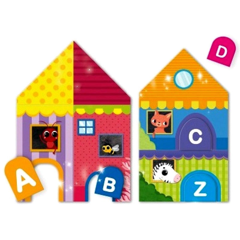 Learn the alphabet in a creative way!A different animal inhabits every house. You just have to match the doors with the correct first letter of the animal! Playing is easy and fun with this self-correcting puzzle. In addition, all of the houses can be matched with different colorful roofs, creating a new scene every time!-Includes: 26 animals houses and 26 letter shaped doors.