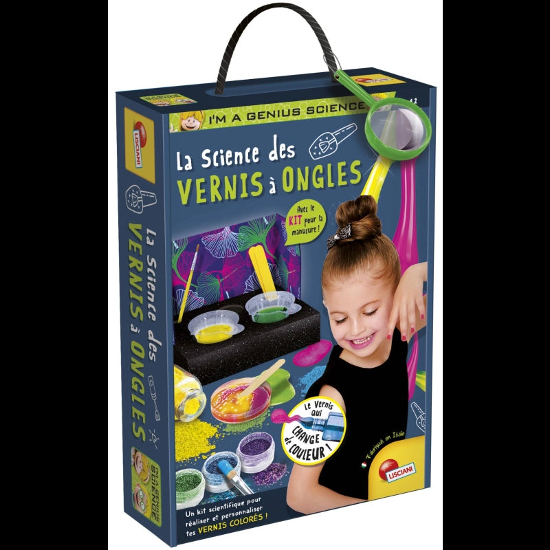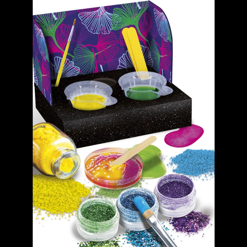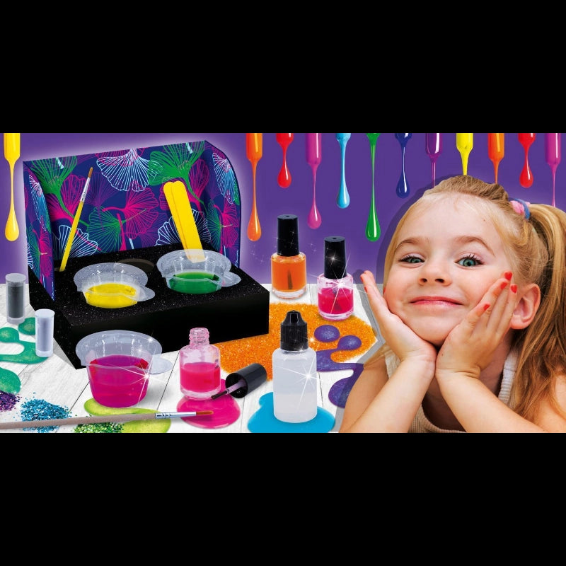 Create and customize your colored nail polishes!Have fun creating colorful polishes and personalizing them with sparkling glitter. Also, your polish will change color every time it comes in contact with cold or hot water!-Includes: Nail polish base, colored pigment, glitter, pigment that changes color with light, pigment that changes color with temperature, small wooden brush, paintbrush, small empty bottles, and illustrated manual.