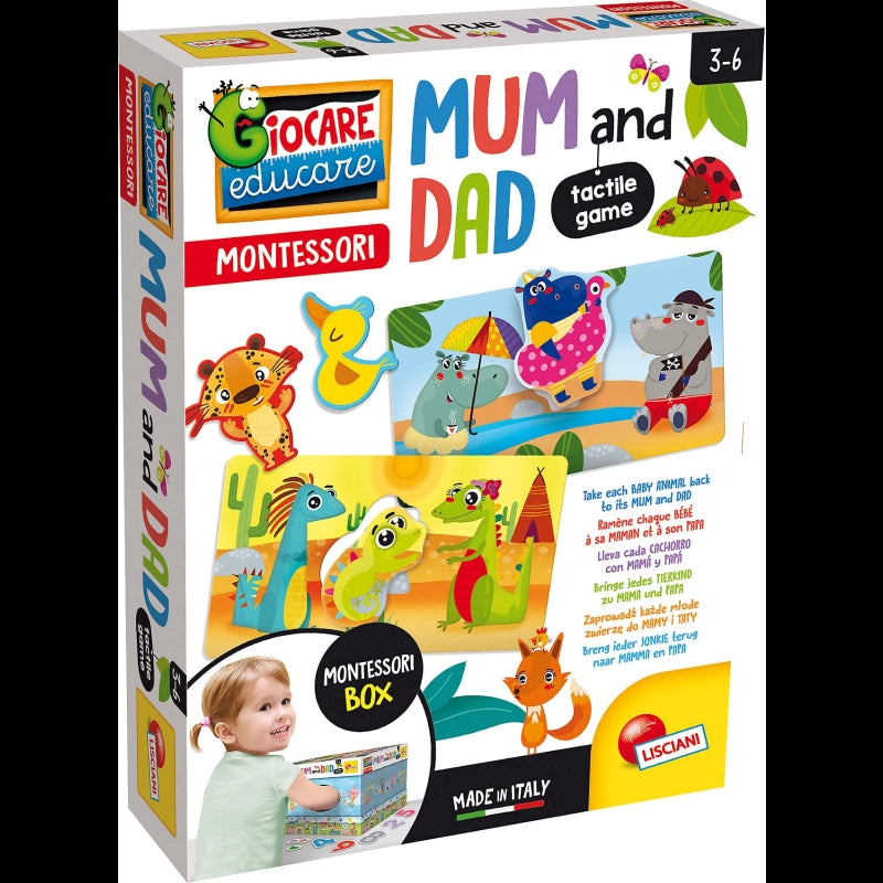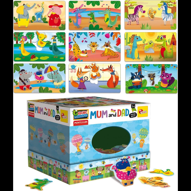 A fun game with lots of happy families! With the unique tactile box with a hole, the kids have to search for the animals using their hands only to take every baby back to mum and dad. Based on the Montessori method, this game involves experience-based learning.-Includes: 15 family cards, baby figurine, tactile box, and instructions.