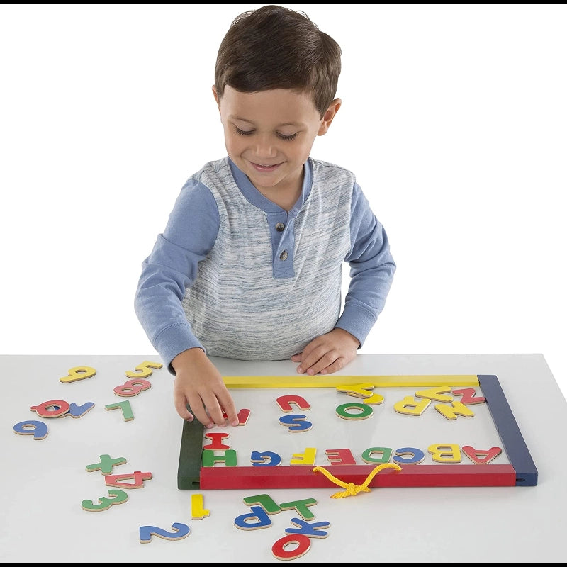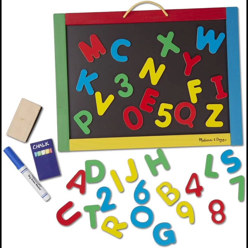 Learn Alphabet and Numbers with this magnetic board!One side is a dry-erase board, the other is a magnetic chalkboard. Whatever your artist's mood, this portable drawing board has the tools to express it! Comes with three sticks of colored chalk, a dry-erase marker, plus 36 magnetic letters and numbers.Double-sided artboard has wooden frame with carrying handle.36 magnetic numbers and letters.-Includes: 36 magnetic pieces, chalk, dry-erase marker, and eraser.