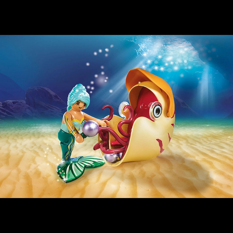 Take a ride in the Mermaid with Sea Snail Gondola!All over the ocean, there are shining pearls to be found. This mermaid is also in search of precious jewels and has already found some. She places them on the coral so that they don't get lost. The large sea snail watches her and gives her tips. -Includes: Figures: Mermaid (figures can bend, sit, stand, and turn their heads). Accessories: Snail gondola, 3 beads, 3 underwater plants, and ammonite.Building instructions