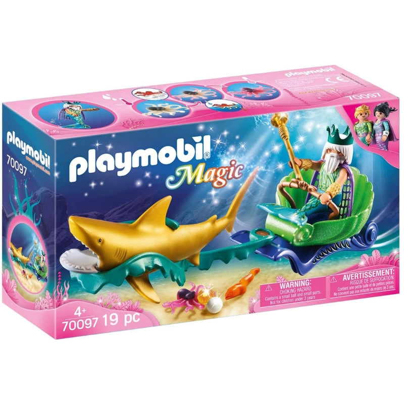The King of the Sea crosses the sea in his Shark Carriage in search of special pearls!He is the king of the sea, the ruler over the people of the sea and all its animals. The handsome sea king proudly drives his carriage, pulled by a large shark, through the ocean and looks to the right. His people are diligent and eager to find pearls of light so that the underwater world does not sink into darkness. The play set contains the Sea King with crown, a seashell carriage, a shark, beads and other accessories.-Includes: Figures: Sea King (figures can bend, sit, stand, and turn their heads). Animals: Shark, baby octopus, and moray. Accessories: Carriage, algae team, 4 beads, bead rod, pair of arm cuffs, crown, and cape.Building instructions