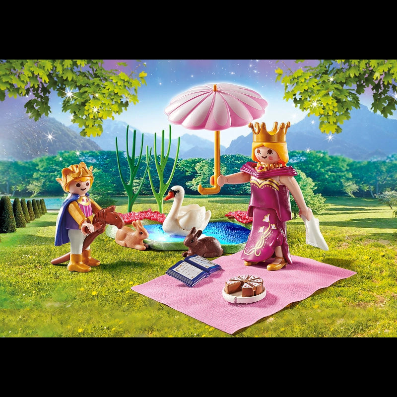 Lets enjoy the delicious cake at the beautiful lake!The queen and the little prince have a cozy picnic by the lake. While Mama spreads out the picnic blanket and cuts the cake into pieces, the prince happily rides around the small pond on his hobbyhorse. A swan curiously watches the boy's activities. The playset contains a Playmobil figure Queen and a child figure Prince, a swan, two rabbits, a picnic blanket, a hobbyhorse and other great extras.Playmobil Starter Packs are ideal as an introduction to a new Playmobil play world and are a great present for children's birthday parties.-Includes: Figures: Queen, prince (figures can bend, sit, stand, and turn their heads). Animals: 2 Rabbits, swan. Accessories: Pond, blanket, umbrella, book, cloth, hobby horse, cake, 2 crowns, 2 reeds, and 2 flowers.Building instructions