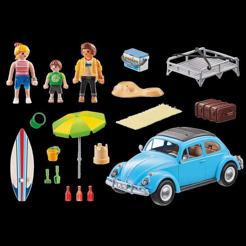 The classic VW Beetle ideal for a family trip to the beach!Now the cult car with its unmistakable shape is entering the cheerful Playmobil world. Of course, the Playmobil Beetle has all the characteristic features that make it so unique, such as the curved fenders, the VW logo, the vertical windshield, the blue paint and the typical rear hood with a 4-cylinder boxer engine. After removing the roof, the lovingly designed interior with beige seats, dashboard and steering wheel is revealed. On the back seat there is space for the child, as well as a cool bag, sand toys and towel. Suitcase and surfboard can be strapped to the roof rack. Now it's time to get in and go to the beach!-Includes: Figures: Woman, man, and child (figures can bend, sit, stand, and turn their heads). Accessories: Volkswagen Beetle, roof rack, suitcase, cooler, surfboard, umbrella, towel, sand pile, sand castle, sand bucket, sand rake, sand shovel, umbrella cap, and 3 bottles.Building instructions