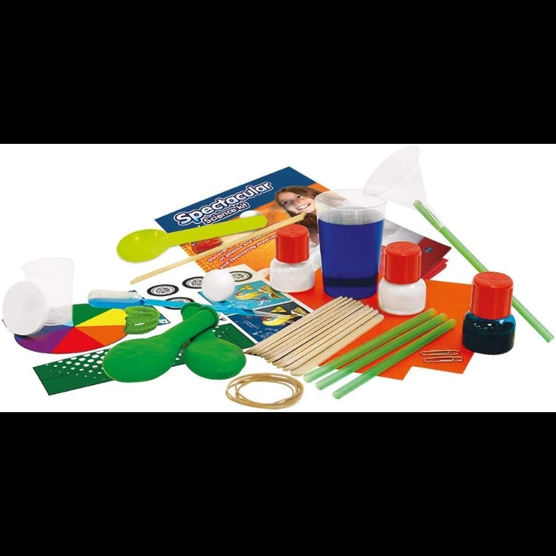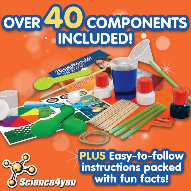 Learn Physics and Chemistry in a fun way!Have fun building and flying an amazing chemical rocket, writing creative top-secret messages, zooming a race car using physics, and so much more! Comes with everything you need plus an educational fun book featuring awesome experiments and fun facts, along with safety rules.-Includes: Science kit with 42 contents for 10 experiments, and educational book.