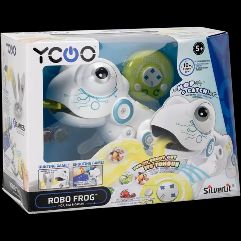 Silverlit Robo Frog is a fun and interactive robot frog - full of fun surprises!It can jump, roll its eyes, turn right/left and it has over ten different cool sound effects. The frog has a sticky magnetic tongue and can catch small metal objects. Play fun hunting game and try to catch the accompanying metallic insects. Or try knocking over the targets by aiming the frogs' tongues.Remote-controlled robot.Rolling eyes.10 different sound effects.Two game modes: Hunting game and shooting game!Remote control actions: jump forward, turn left/right and catch.-Includes: Robo Frog, remote control, 4 metallic insects, and target board.