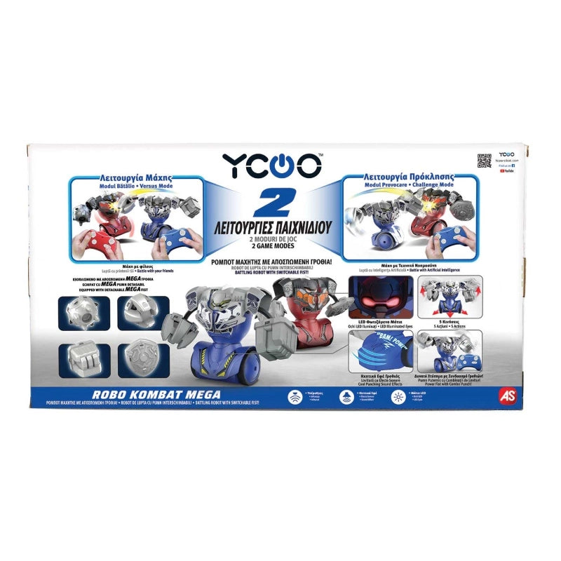 Introducing ROBO KOMBAT MEGA, Battling Robot with Switchable Fist!A Set of 2 Remote Controlled Battling Robots with 4 easily attaching on and off, interchangeable MEGA FIST for different tactical needs! Each robot comes with cool LED eyes and punching sound effects! Features 2 exciting gameplays battle with AI and Versus mode (battle with friend).-Includes: Two very durable robots, two controllers, 4 interchangeable fists and instructions.