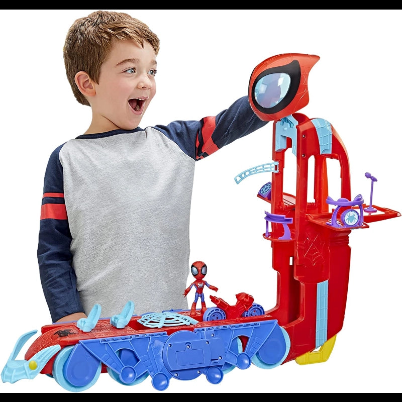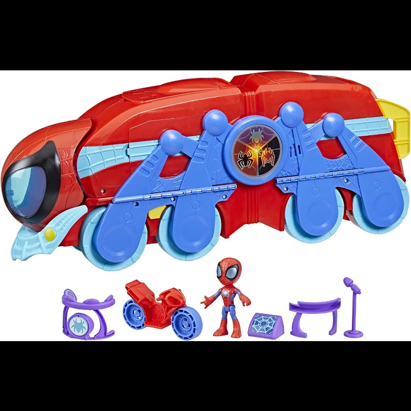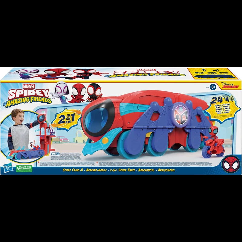 Web-out with the exciting Spidey and His Amazing Friends Spider Crawl-R HQ playset!This 2-in-1 Super Hero playset with lights and sounds converts from a large-scale rolling vehicle into a 2-foot-tall (60.96 cm) HQ tower! When the playset is in tower mode, kids can imagine planning missions at the command center, stage a pretend show using the included instrument accessories, swing on the web arm, and more! Pull out the ramp, and the Spidey action figure can speed down on the included motorcycle! In both vehicle mode and playset mode, preschoolers can eject the web bumper to knock troublemakers out of the way!  -Includes: Converting vehicle playset, action figure, motorcycle, and 3 accessories.