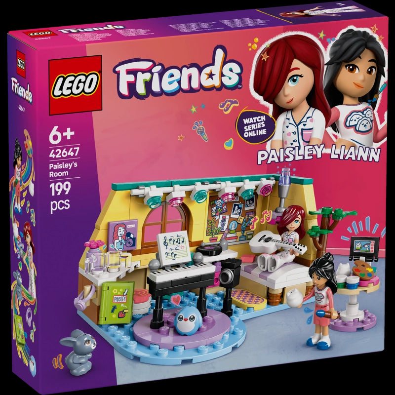 Take on a new building adventure with these inspirational LEGO® sets!Hanging out with a friend is so much fun! Today Paisley has invited Liann to spend time in her room. It’s the perfect place for a day of creativity. The girls have fun painting figurines and making music. When it’s time for a break, they love to play with pet bunny Melody. Then Paisley reveals the bed’s secret compartment where she keeps her diary. Creative days with friends are the best!This set is available in the LEGO® Builder app, where builders can zoom in and rotate models in 3D, as well as track and save progress.The bedroom model measuring over 2.5 inches (6 cm) high, 5.5 inches (14 cm) wide, and 3.5 inches (9 cm) deep.LEGO® sets are made of high quality materials under the best quality and safety standards.Launch date: Jan 01, 2025.-Includes: 199 pieces including 2 minidolls, a pet bunny figure with the feeding and watering accessories, and building instructions.