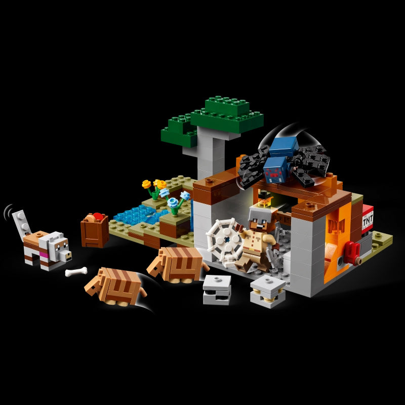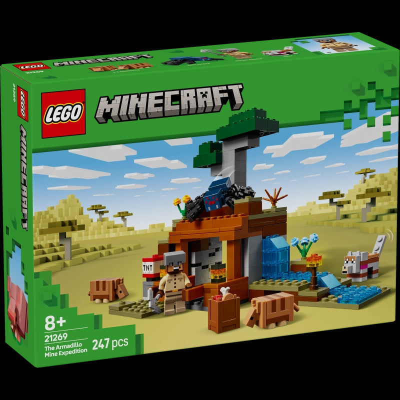 Take on a new building adventure with these inspirational LEGO® sets!Enter the savanna biome to mine for ore. Join forces with friendly armadillos and a wolf! A cave spider lurks in the shadows. Feed its eyes to the armadillos to get scute for crafting wolf armor. Trigger a TNT explosion to blast away rocks and uncover precious ore. Then rearrange the terrain for your next thrilling Minecraft® adventure! The action takes place in the game’s savanna biome, and the set features a mine with a lever-controlled TNT function that blasts away a piece of the terrain to reveal precious ore.The completed playset measures over 5.5 inches (15 cm) high, 7.5 inches (20 cm) wide, and 4.5 inches (12 cm) deep.Launch date: Jan 01, 2025.-Includes: 247 pieces and building instructions.