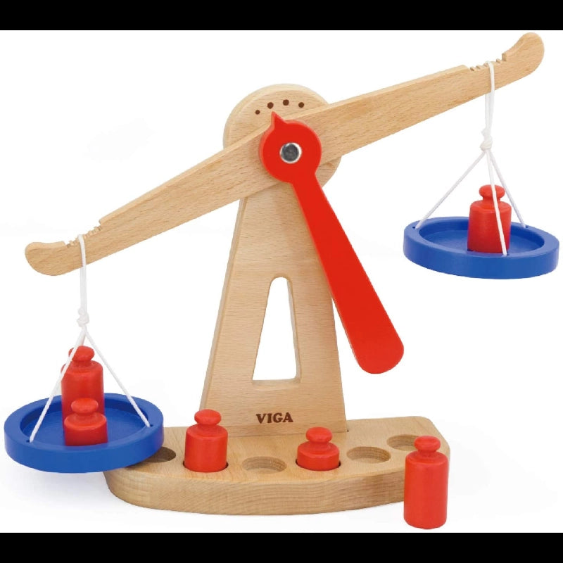 Help your child learn the theory of balance by playing and experimenting with this wooden balance scale from Viga!This toy scale is made of high-quality beech wood.The load trays can move on the scale arms to reach a balancing angle before loading the weights.Teaches kids about weight and weight differences, and help them learn the theory of balance through balancing the scale.-Includes: Stand, 2 load trays (8 cm diameter), and 6 weights of 3 different sizes.