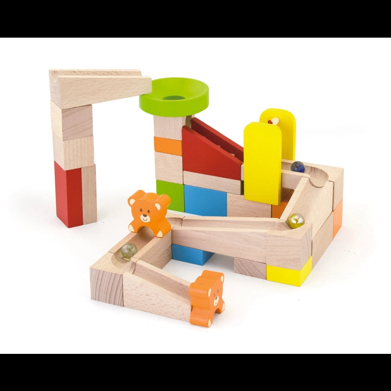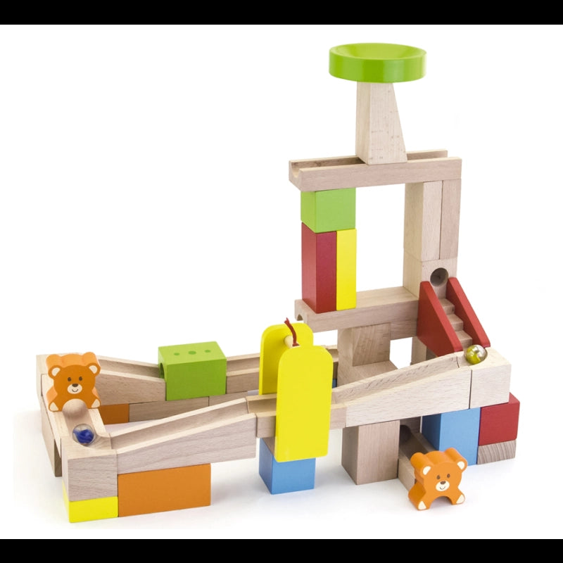 Watch the marbles spiral and hop down the track you made!High-quality crafted building blocks, natural as well as brightly painted, offer little architects plenty of creative scope for their ideas! Build a fantastic marble run with this brilliantly colored set. There are ten different recommended setup drawings on the instruction are ordered by level from beginner to master, but never mind, just free the kids.-Includes: 49 wooden pieces.