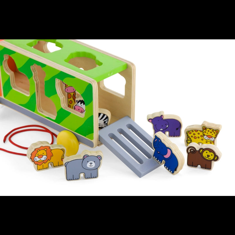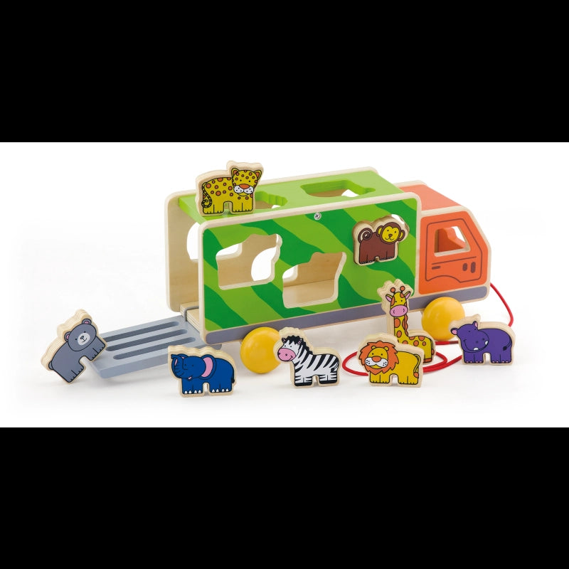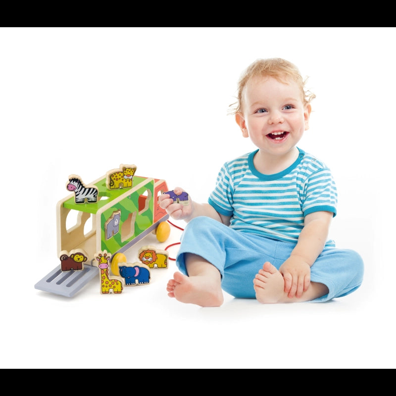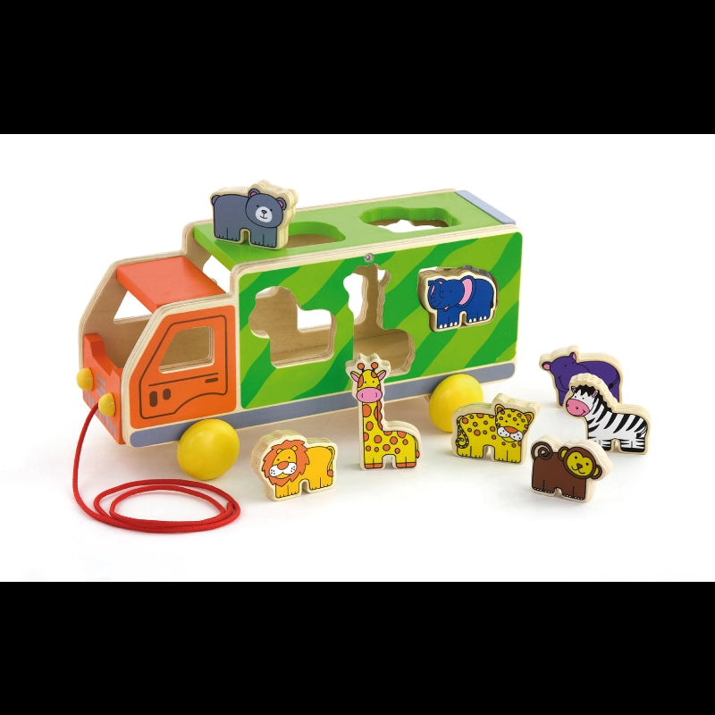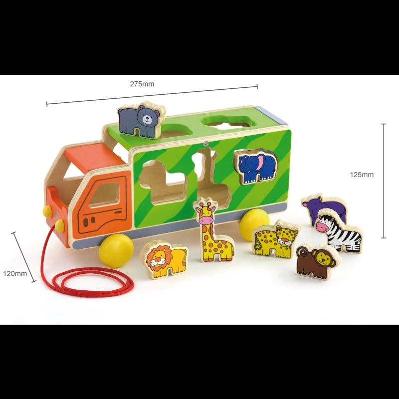 Have fun with this cute animal truck!Fit the various wooden animals including lion, giraffe, hippo, bear, zebra, elephant, monkey and cheetah into the truck through the matched holes.Encourages toddlers to walk more. Roleplay fun with the wild animals gathering together.The multi-functional wooden pull along truck with animal sorting adds more fun and educational learning values, not only helping to learn shapes and animals but also improving hand-eye coordination, motor skills, and manual dexterity.-Includes: Wooden truck sorter and 8 animals.
