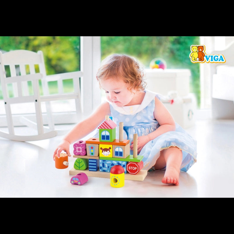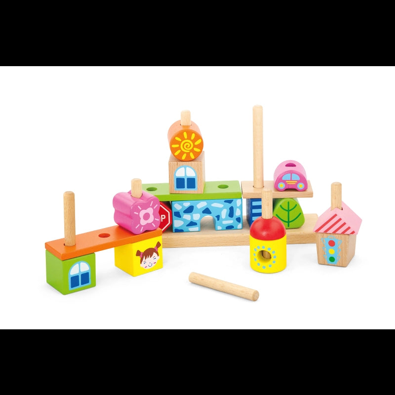 Your kids will enjoy stacking this city!This four row mini city is built up with colorful blocks made of high-quality wood.Mix and match the pieces to tell the story of city life with an unlimited imagination.Good to train color and shape recognition, as well as hand-eye coordination.Proper size and smooth edge can well fit little hands.-Includes: 8 sticks, 4 patterns, and 14 different blocks.