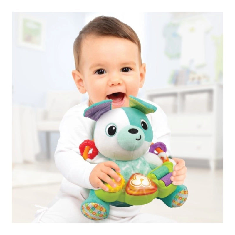 Play-with-Me Puppy will become your little one's favorite pal!Plush cuddly puppy with removable activity ring and crinkle peekaboo ears.Colorful activity ring with rollers, sliding bead & spinner.Press and turn the circle button and press the triangle button for early learning, fun sounds and phrases, song & melodies, and flashing light.Batteries included.Designed based on Winfun CPS parenting system for developing the baby's cognitive, physical and social skills.-Includes: Interactive Play-with-Me Puppy toy.