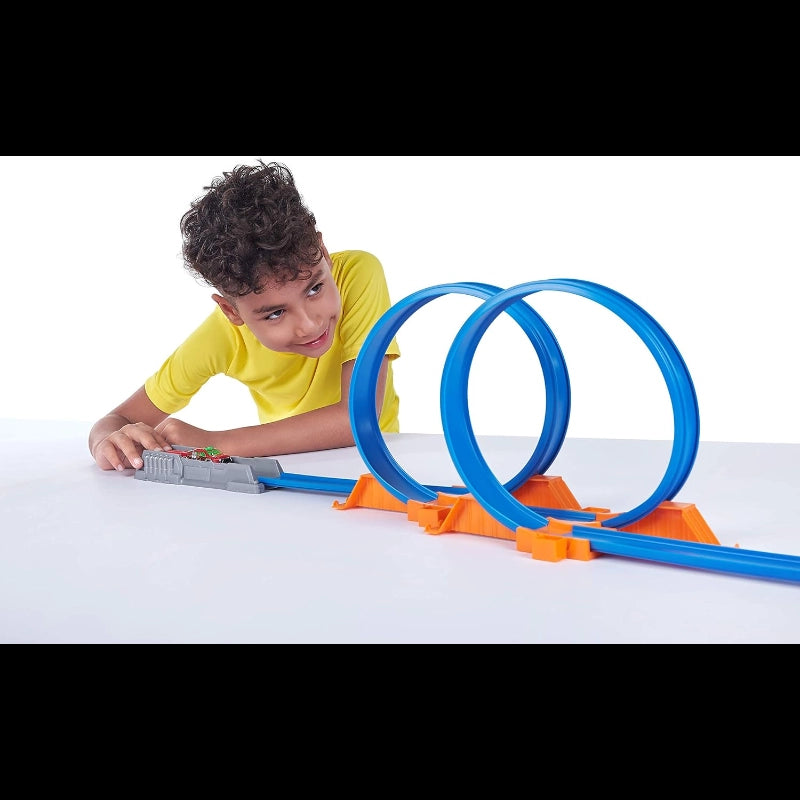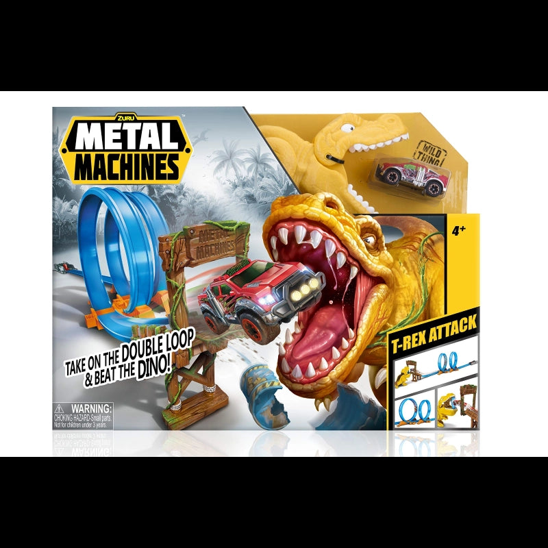 Launch your metal machine T-Rex attack and Knock off that dinosaur!Launch your Wild Thing furiously with the powerful Metal Machine launcher, and knock down the T-Rex that has been terrorizing the region! Can you build enough power to speed past the double 360 loops and straight through the T-Rex, knocking it off of its feet, or will you become dino-food?-Includes: Metal Machine, powerful launcher, racing track including two 360-Loops, stunt ramp T-Rex, and instruction manual.