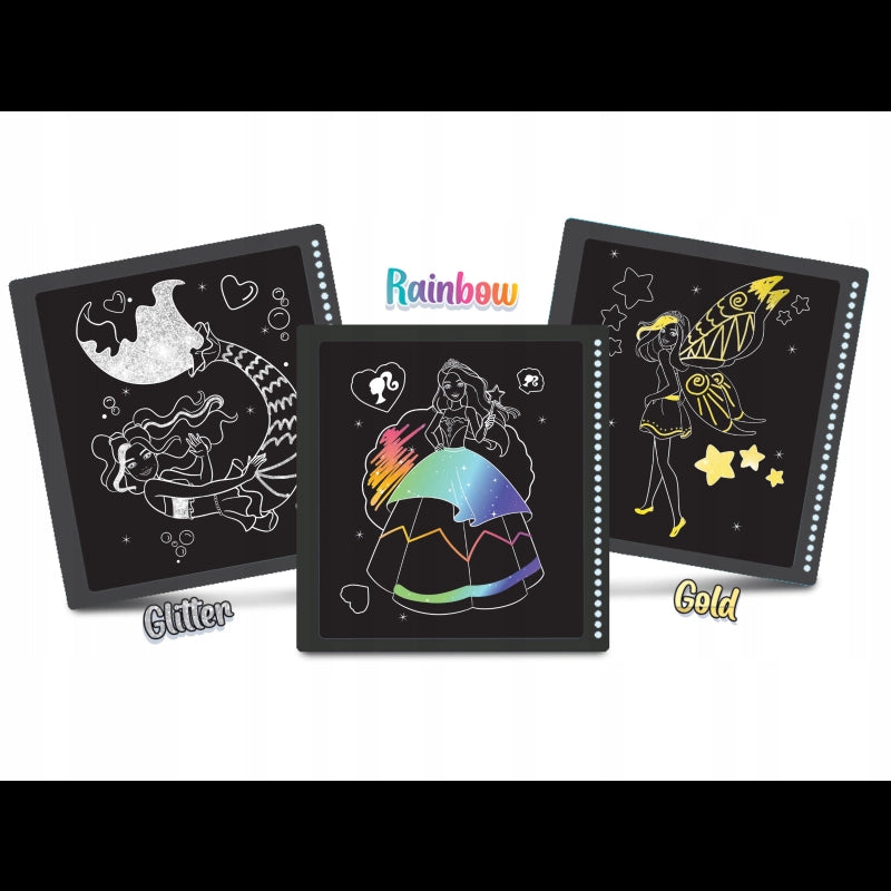 Discover the magic of colors with Barbie's scratch off revelation in the new Cutie design!Use the included pen to scrape off the black top coat from the sheet and discover the bright colors of the rainbow with fantastic shades, lots of glitter and gold embellishments.-Includes: 44-page scratch card sketchbook and scratching pen.