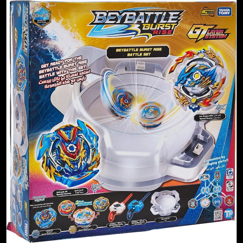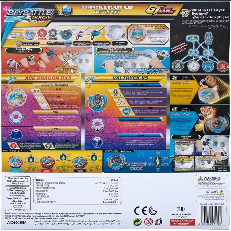 Burst your rival Beybattle top with this Beybattle!Beybattle top is a customizable battling top. Customizing Energy Layer, Forge Discs and Performance Tip enables various performance top battles. Collect, combine and customize to enjoy various battles with your friends! This battle set that includes everything you need to challenge your friends.Two BeyBattle tops, each with unique abilities:Ace Dragon DX5 - GT Ability: Sting disc which has the spring bounces off and momentums due to recoil. The more it attacks the more it accelerates and puts on power!Valtryek V5 - GT Ability: The impact when attacking opponent makes the driver tip shrink and allows the tops to attack from a low point. Along with this the lock becomes harder and can strike opponent with its full strength.-Includes: 2 Energy layers, 2 forge discs, 2 performance tips, 2 launchers, 2 ripcords, beystadium, 2 labels, and instruction sheet.