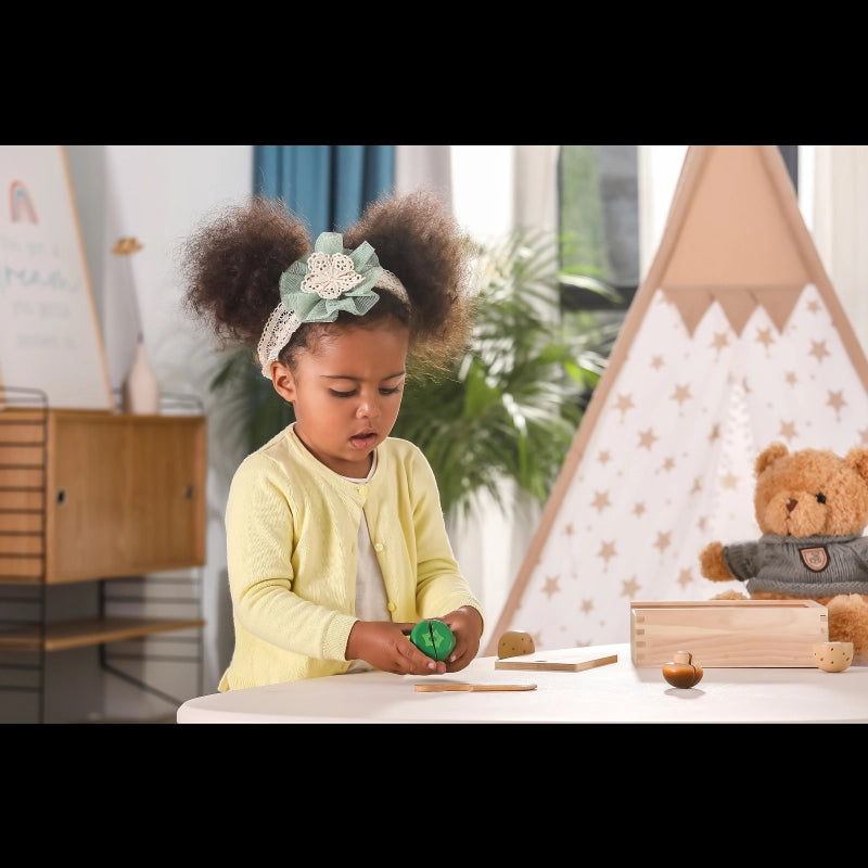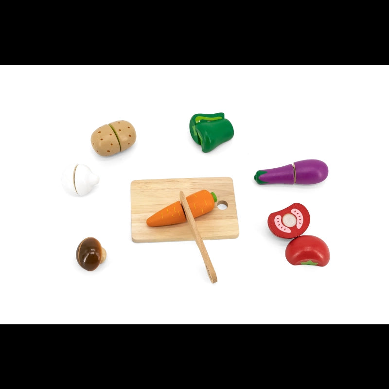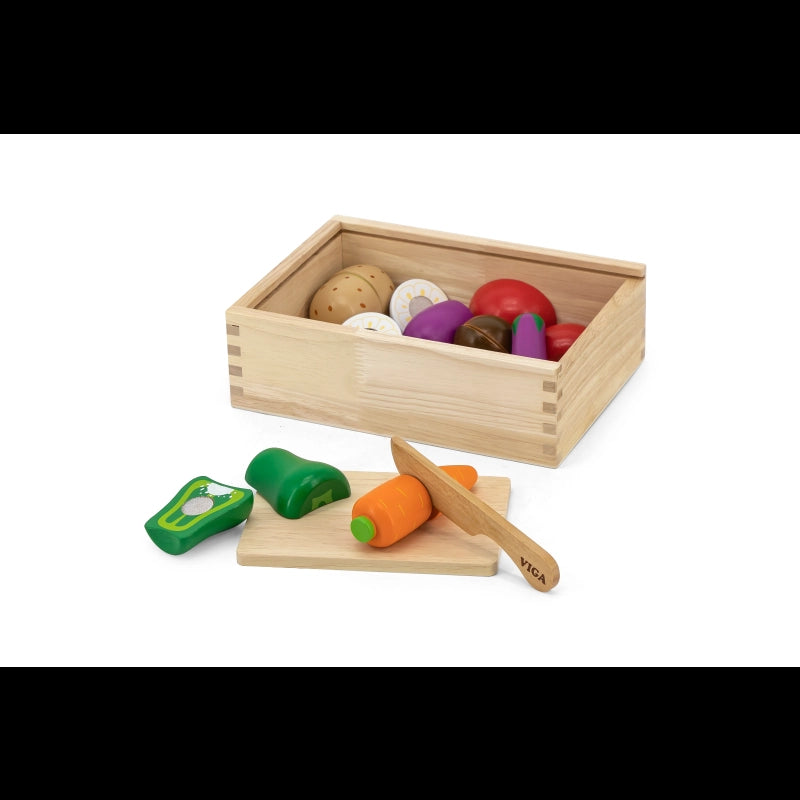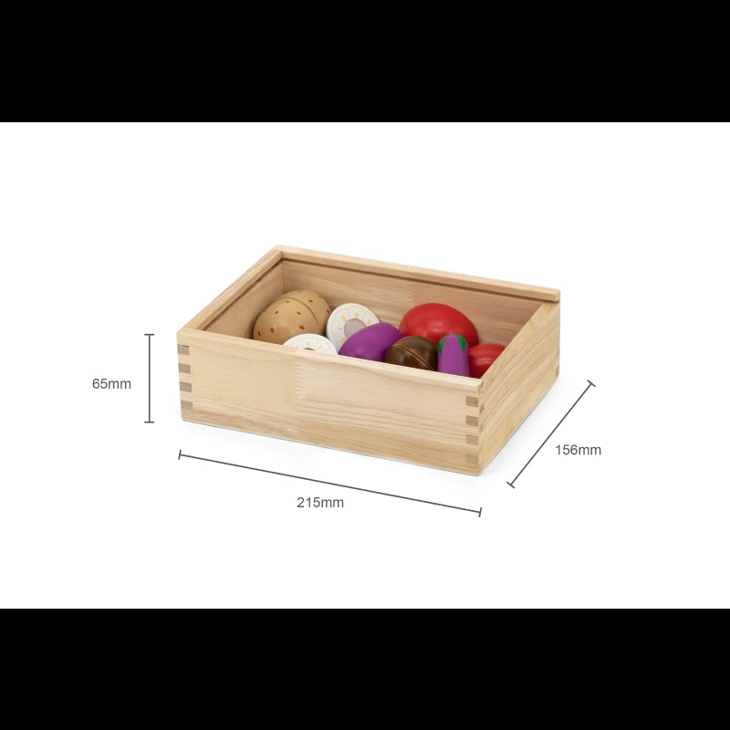 &nbsp A wooden food playing set for kids to play with and learn their healthy eating habits!Smooth surfaces and non-toxic materials ensure safe to play even while the smallmouth touches the toy.Cut vegetables in half and serve them to your customers, it is a great role-playing toy for kids and improves their imagination ability.After tasting the food, kids can fit them back together again with Velcro.While cutting and fitting, kids' hand-eye coordination and motor skill can be perfectly explored.Comes in a wooden box with acrylic sliding lid for cleaning up and storage.-Includes: Various vegetables, a safe knife, a cutting board with a handle for easy transporting, and a wooden box with an acrylic sliding lid.