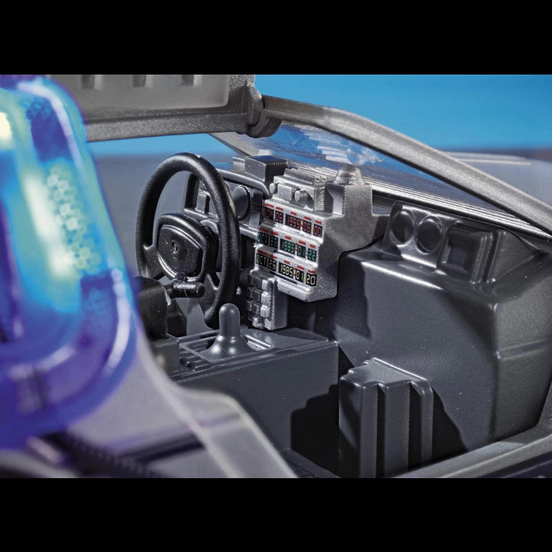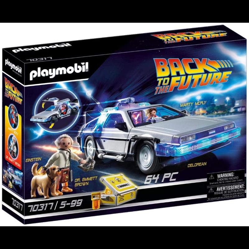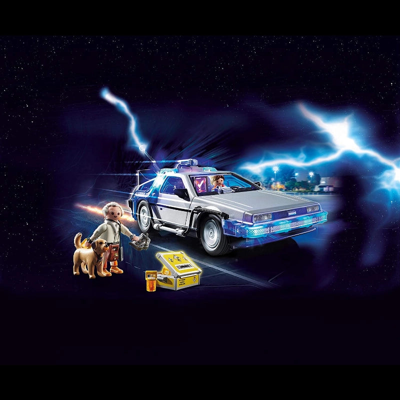 Head Back to the Future in the iconic, time-traveling DeLorean!Playmobil goes back to the future with this Playmobil Back to the Future DeLorean set! The iconic DeLorean features folding wheels for hover mode, doors which open upwards, an illuminated flux capacitor inside and illuminated exterior. Also included is plutonium, which can be inserted at the back of the vehicle. The playset is complete with Marty Mcfly and Doc Brown in their outfits from 1985. Includes a plutonium case, skateboard, remote control and Einstein, the dog.-Includes: Figures: Marty McFly, Doc Brown (figures can bend, sit, stand, and turn their heads). Animals: Einstein (dog). Accessories: Delorean car, skateboard, camera, remote control, walkie talkie, case, 3 plutonium rods, and pantograph.Building instructions