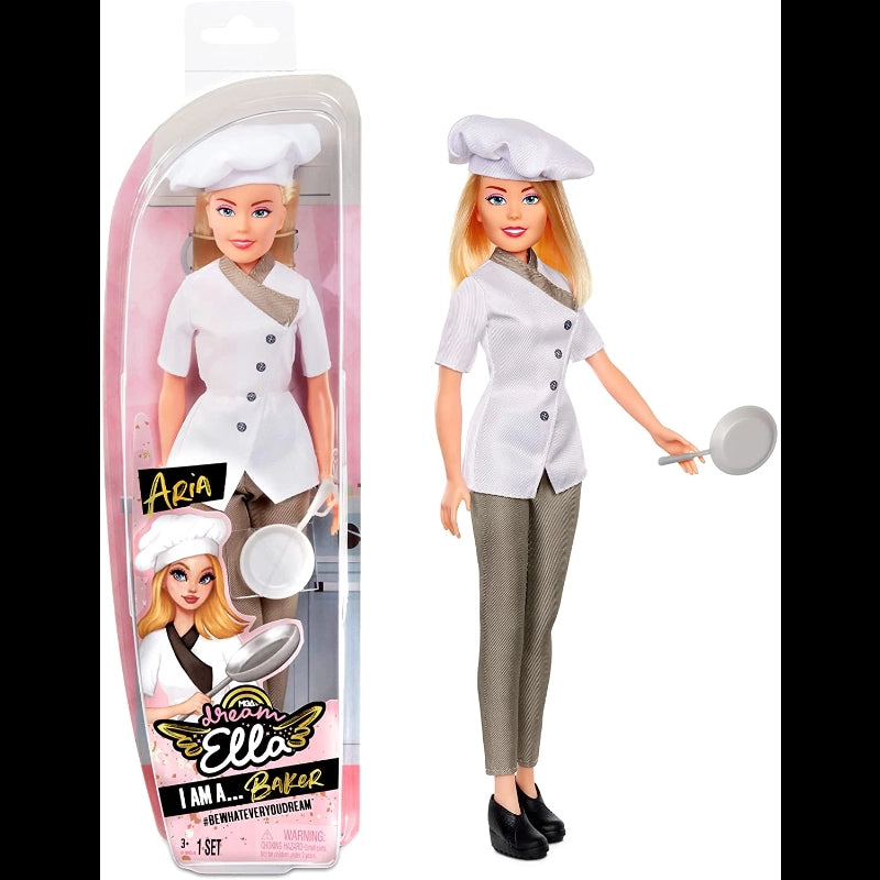 Aria inspires kids to be whoever and whatever they can imagine!Dream Ella I AM A Baker Aria Fashion Doll is perfect for kids who are interested in releasing their creativity in the kitchen. Aria is ready to make delicious food with her pan.Aria doll is 11.5-Inch (29.2 cm) tall.Kids can jump into storytelling adventures with Dream Ella I AM A Baker Aria Fashion Doll.-Includes: Doll, chef outfit, pan and hat.