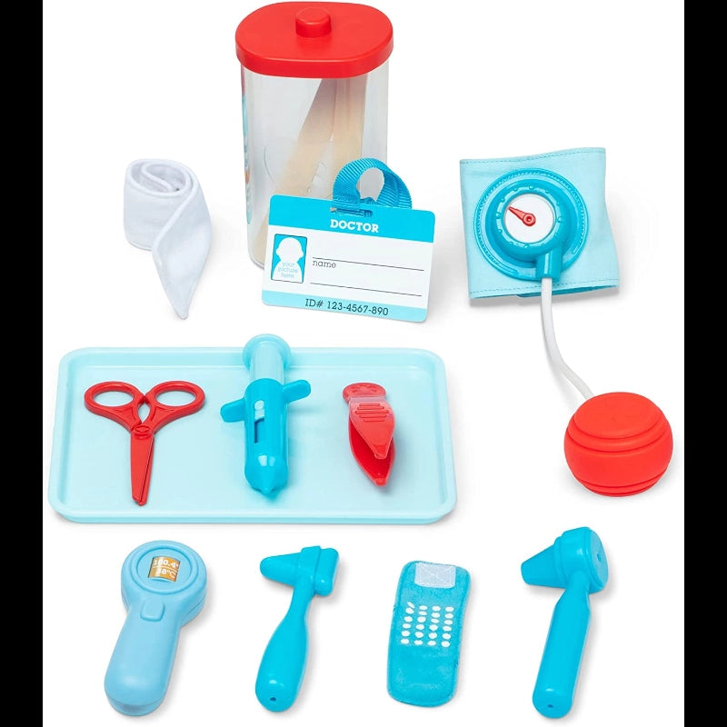 The doctor will see you now!  The 25-piece Melissa & Doug Get Well Doctor's Kit Play Set offers realistic accessories let little doctors help patients get well! Kids can pretend to check temperature, heartbeat, blood pressure, eyesight, hearing, and more. There are play tools like a syringe, play scissors, and reflex hammer, as well as play bottles, and bandages for examining and treating patients. Reusable activity cards and fun details like an ID badge on a lanyard and a magazine for patients in the waiting room round out the doctor's office experience. The play set is a fun and engaging way to ease any feelings of stress associated with a visit to the doctor and to encourage nurturing and empathetic play. Spark a child's creativity and imagination, and inspire young healers for years to come!-Includes: 25-piece doctor’s kit play set with realistic pretend play patient care essentials.