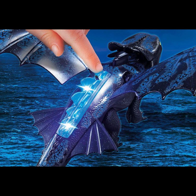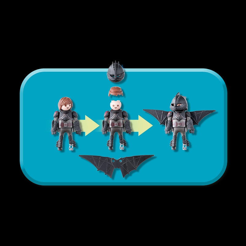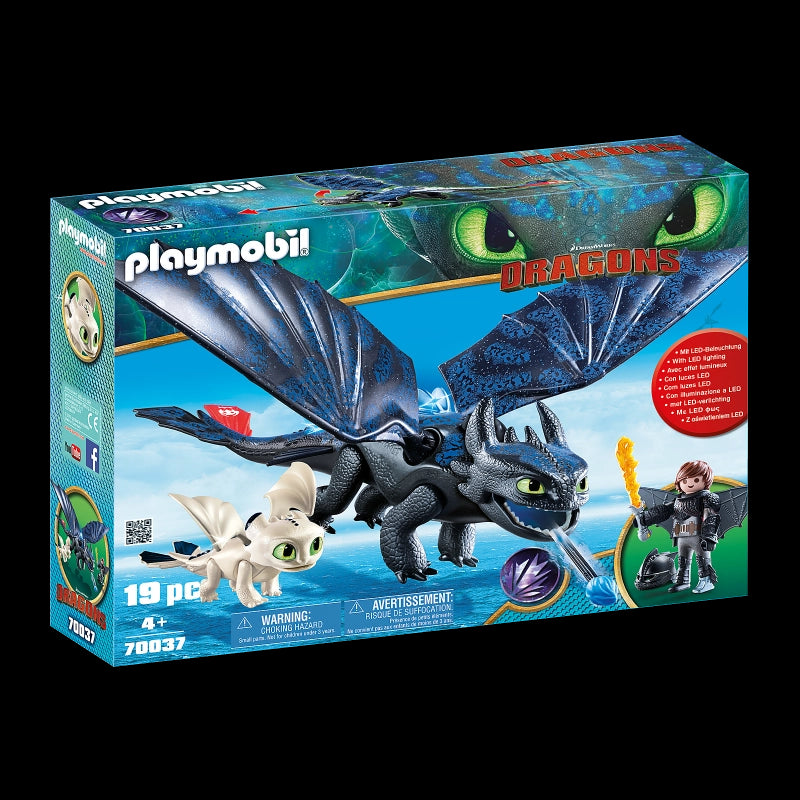 Hiccup and Toothless lead the dragons and inhabitants of Berk on a fight against Grimmel!In the last chapter of the Great Dragon Saga, Hiccup and Toothless are confronted with exciting challenges and dangers too. A new type of enemy threatens not only the Vikings and Berk, but also all dragons. The friends get unexpected help as Light Fury emerges. With the appearance of the white dragon lady it becomes clear that Toothless is not the last night shadow dragon in the world. Unbelievable new possibilities have opened up. The play set consists of Hiccup in a flight suit, Toothless with a white baby dragon, as well as other magical accessories. The DreamWorks Dragons from Playmobil are back. Nine cool, exciting game sets with loads of new dragons promise exciting adventures for all dragon fans.-Includes: Figures: Hiccup (figures can bend, sit, stand, and turn their heads). Animals: Toothless and baby dragon. Accessories: 3 bolt guns, sail, helmet, wing, fire sword, and wig.Building instructions