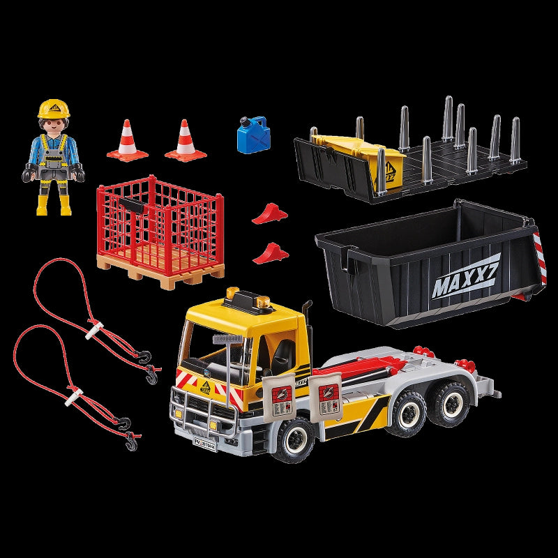 Transport materials to and from the construction site with this Interchangeable Truck!Heavy materials often have to be transported on the construction site. For this purpose modern trucks are used. The body of the truck can be changed flexibly: The trough is used for transporting bulk material. When the worker arrives at the construction site, the trough is unloaded first. Carefully the lifting device is set in motion and the trough is lowered to the rear. Thanks to its practical rollers, the body is unloaded in no time. Then the construction worker starts to load the stake trailer in order to bring equipment, broom, guide cone and canister to the next construction site. The playset consists of a Playmobil construction worker with helmet and gloves, a truck with swap body, a trough, a stake trailer, an equipment box with lid, a petrol canister and many other extras. The roof of the truck driver's cab is removable. -Includes: Figures: Construction worker (figures can bend, sit, stand, and turn their heads). Accessories: Truck, canister, broom, construction helmet, trough, transport attachment, wire mesh box, toolbox, 8 fastening elements, clamping rubber, and 2 bags.Building instructions