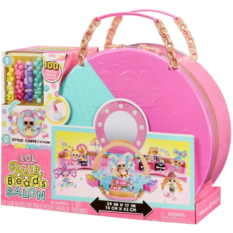 Discover what’s inside this salon playset!This all-new play pattern allows you to make your own customized, buildable Hair Beads hairstyles for your tots using just beads and water! The Tot included is ready to show off their hair beads hairstyles that you design! Simply wet the hair strands, then place the beads over top and give them a spray of water and watch them fuse together to make a colorful, unique hair beads hairstyle for your doll! You can do it over and over again whenever you want to try a new hairstyle!-Includes: L.O.L. Surprise Hair Beads Salon playset, L.O.L. Surprise Hair Beads Tot doll, 100 hair beads, hair styling salon for the doll, hair ties that you can use in your own hair, vanity mirror for your dolls, large vanity mirror that you can use.