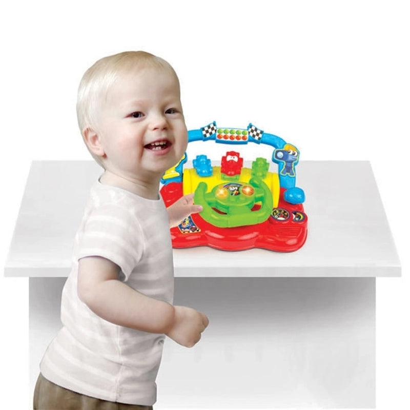 Enjoy an interactive driving experience with this Lil' Racer Steering Wheel  from winfun!Interactive steering wheel with race car action.Twist the ignition key to hear start up sounds.Move the gearshift forward and back to make the middle car race forth and back.Turn the steering wheel left and right to make the cars turn sideways.Twisting ignition key, moveable gearshift, and turning steering wheel with realistic sound effects.Light-up button on steering wheel with melodies and cheering sound effects.Designed to improve child's fine motor skills, encourage thinking and develop self expression.Batteries included.Designed based on Winfun CPS parenting system for developing the baby's cognitive, physical and social skills.