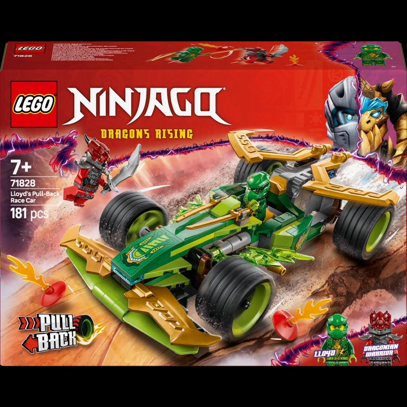 Take on a new building adventure with these inspirational LEGO® sets!Speed into action with Lloyd in his amazing Pull-Back Race Car! Armed with 2 golden katana swords, Lloyd is ready for an epic battle against the demon Dragonian Warrior who wants to seize control of the merged NINJAGO® world. For a turbo boost, hop into the cockpit, pull back the car and watch it zoom forward at an incredible pace! Can you help Lloyd stop the feral Dragonian? The sleek race car toy has 4 tires and a cockpit and is decorated with green lightning blades. It also comes with 2 lighting elements to set up a small obstacle course.This Building kit includes Lloyd with 2 golden katana sword accessories and a Dragonian Warrior with a sword accessory.Look out for more NINJAGO® toys (each set sold separately) featuring dragons, mechs and vehicles.This race car toy measuring over 2 inches (5 cm) high, 7.5 inches (19 cm) long, and 5 inches (12 cm) wide.Launch date: Jan 01, 2025.-Includes: 181 pieces and building instructions.