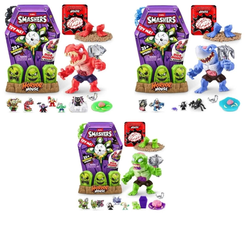 Embark on a spine-tingling adventure inside the Smashers Mega Horror House!Smashers Horror House takes you on a spooky quest. Smash, dig, and dissect, to bring your monster to life. Place the brain in your monsters head along with the eye to activate spooky lights and sounds. With 35+ surprises inside, are you brave enough to open the coffin and unearth a monster?-Includes: 36 pieces.