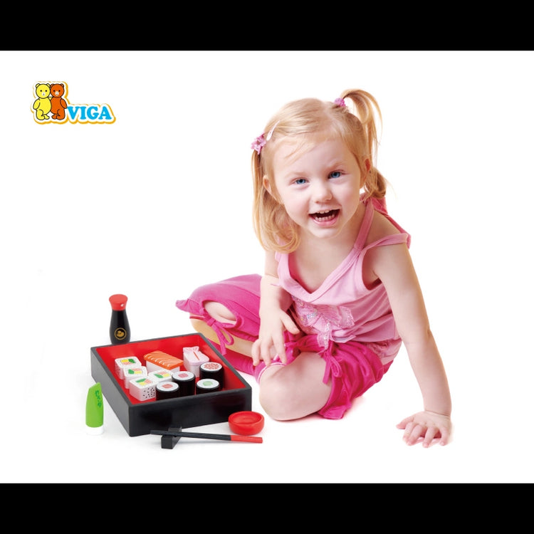 Fun food playset of full sushi set with lots of details! Encourage teeny chefs of the future to engage in fun-filled role play with this Chinese food playset.Helps little ones develop fine motor skills, and Inspires pretend cooking and social skills.Smooth surfaces and non-toxic materials ensure safe to play even while the smallmouth touches the toy.-Includes: California roll with 4 cuts, 4 sushi, 2 nigiris, a tube of wasabi, a bottle of soy sauce, a bowl, a pair of chopsticks, and holder.