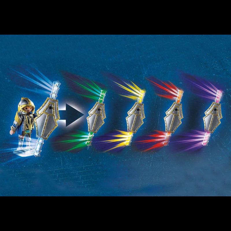 The battle continues between the Knights of Novelmore and the Burnham Raiders!  The knights are ready to defend their kingdom bravely. This time the raiders are plotting to attack the Temple of Time and steal the Invincibus, the most powerful armor ever made! But the knights are always ready to ward off any evil plan. This temple of time features a rotatable armor stand that comes with shooting function, lightning temple sword that changes colors as well.-Includes: Figures: 2 Knights, magician (figures can bend, sit, stand, and turn their heads). Accessories: 2 Arm cuffs, 3 capes, 2 x headdress, magic hat, 2 gloves, belt pouch, and base plate.Building instructions