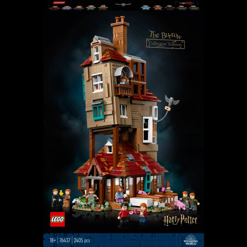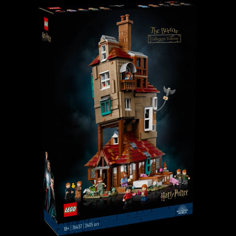Take on a new building adventure with these inspirational LEGO® sets!Add The Burrow to your LEGO® Harry Potter collection of iconic Wizarding World locations. Use special techniques to capture the rickety look of the Weasleys’ family home. Open up the playful display model to view the authentic details and magical features. Check out the fireplace, which has a Floo Network function to make a minifigure ‘disappear’, magical dishwashing in the kitchen, and more! Rare building kit.10 LEGO® minifigures included: Percy Weasley, Charlie Weasley, Bill Weasley, Molly Weasley, Fred Weasley, George Weasley, Arthur Weasley, Ginny Weasley, Ron Weasley and Harry Potter, plus an Errol figure.Use clever LEGO building techniques to recreate the rickety, twisted details of The Burrow and build a little pigsty outside for the 2 pig figures.This set is available in the LEGO® Builder app, where builders can zoom in and rotate models in 3D, as well as track and save progress.The Burrow model in this set measures over 18 inches (46 cm) high, 9.5 inches (25 cm) wide, and 9 inches (23 cm) deep. Launch date: Jan 01, 2025.-Includes: 2405  pieces and building instructions.