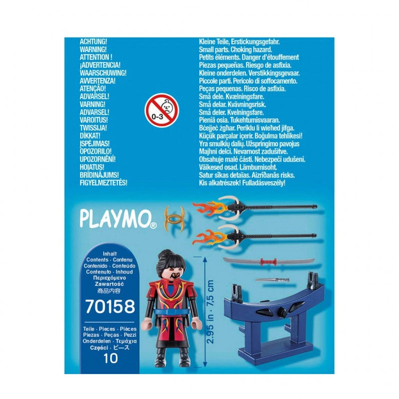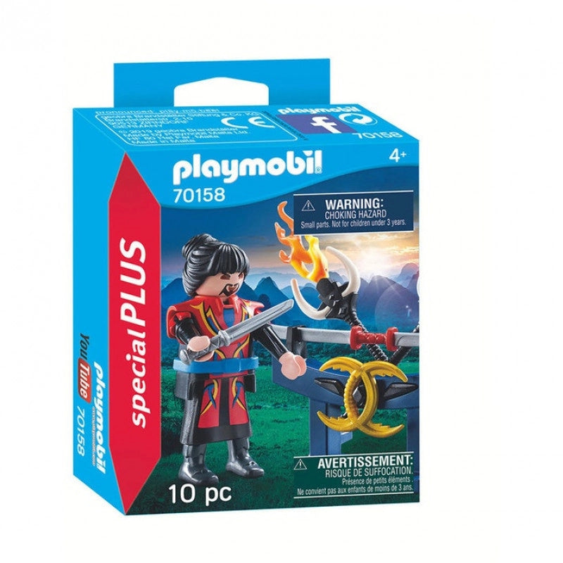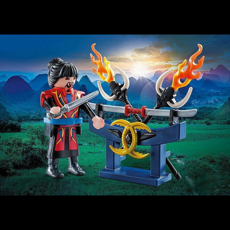 The mighty warrior will defeat his opinions with his great skills!Martial arts has centuries of tradition. In order to be able to use all the different weapons correctly, the Warrior practices daily to improve his art. Playmobil Special Plus Sets guarantee extra fun at a low price. To collect, play and give away!-Includes: Figures: Asian fighter (figures can bend, sit, stand, and turn their heads). Accessories: Sword, weapon stand, and more.Building instructions