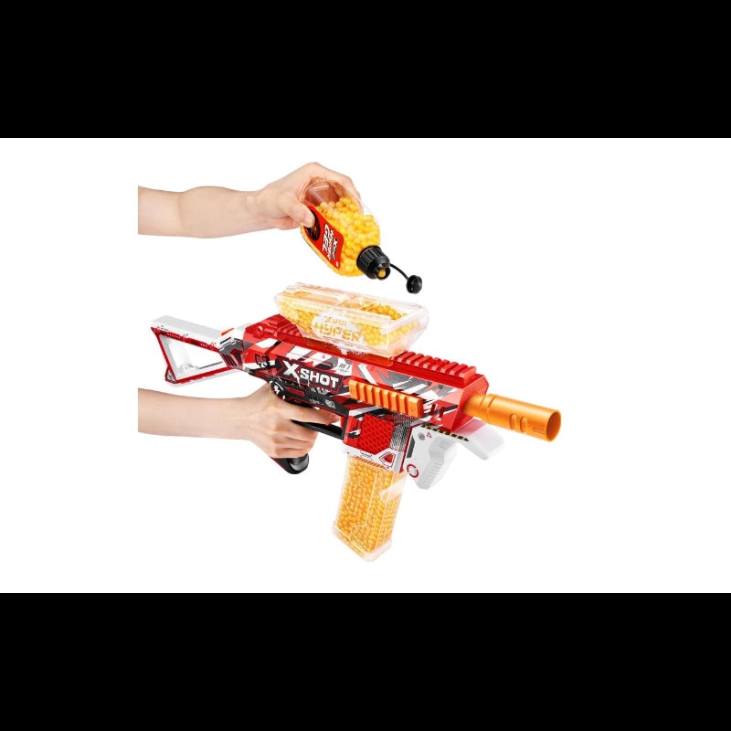 It's time to get hyped up with X-Shot Hyper Gel!The X-Shot Hyper Gel Trace Fire can blast Hyper Gel Pellets at 170 feet per second (186 km/h) with its motorized fully and semi automatic modes. The Trace Fire blaster has a 600 Pellet capacity hopper, and an additional 850 Pellet capacity mag (Total1,450 pellets). Stocked with 10,000 Hyper Gel Pellets and protective eyewear, just add water to start the ultimate Gel Blaster battle!-Includes: Blaster, 10,000 Hyper Gel Pellets, protective eyewear and rechargeable battery.