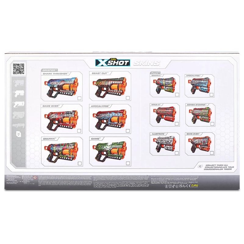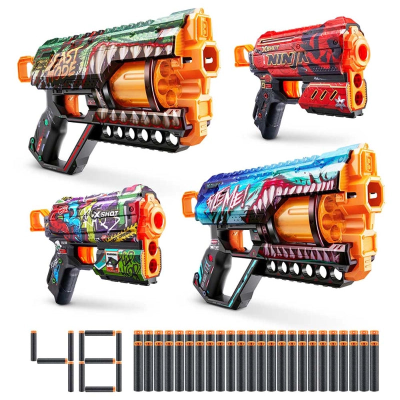 X-Shot Skins brings the in-game experience of skinning your blaster into the real world!Choose your Skin and join the battle. Get ready for a battle with the X-Shot Skins Mix Combo. Perfect for a tagger or anyone wanting to battle it out street style! The Griefer blasters blow away the competition with a rapid-fire of 6 darts in under 30 seconds using the rotating barrel, plus extra dart storage below to keep you locked and loaded in battle. The X-Shot Skins Flux has a single dart capacity with additional front 2 dart storage, to keep you stocked for battle. The blasters can take out your enemies up to 27m (90 ft) away! X-Shot Skins darts include new air pocket technology for a faster, further, and more accurate shot.  -Includes: 4 Blasters (2 Griefer and 2 Flux) and 48 darts.